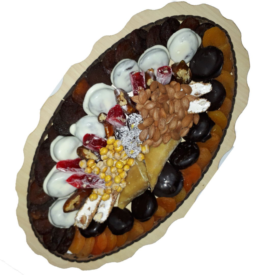 Kuru meyve çeşitleri ile şekerleme lokum çeşitlerini bir araya getiren mükemmel hediyelik paket.